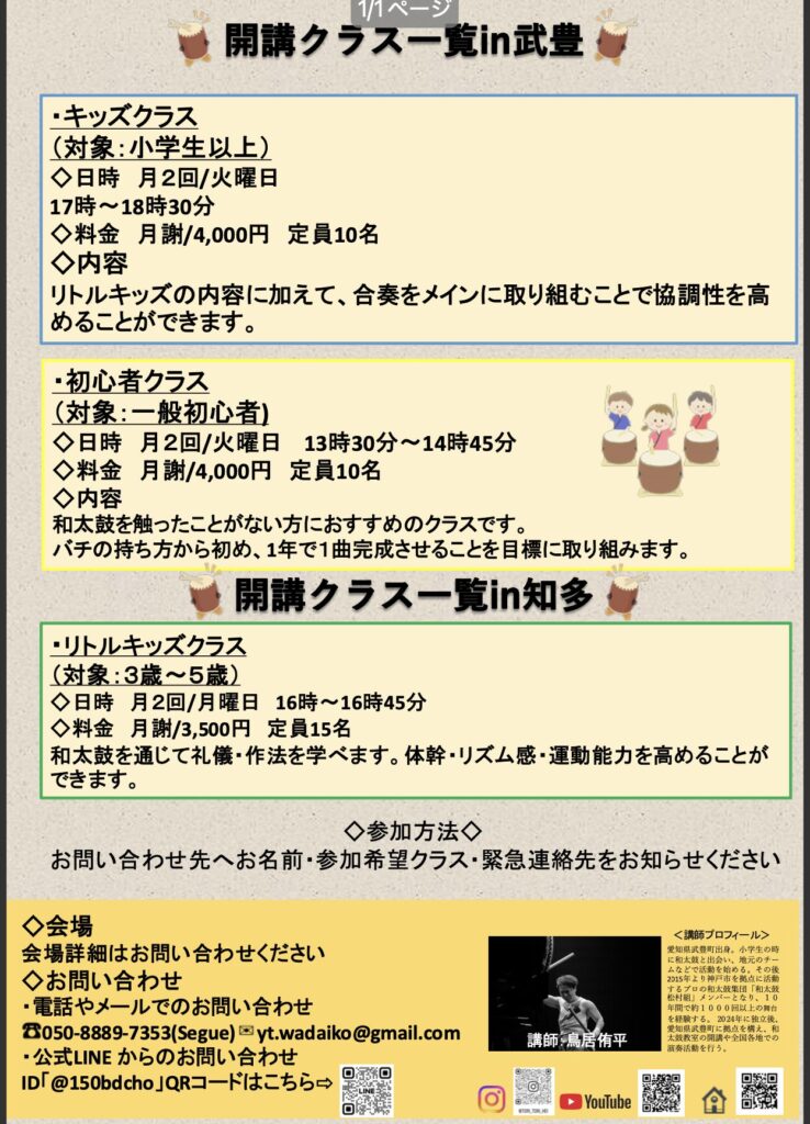 例えば、私鳥居侑平が講師をしている**和太鼓教室“縁”**では、